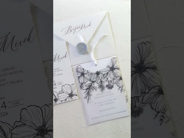 Niezwykły i wyrafinowany zestaw, w którym każde zaproszenie jest ozdobione wzorem z czarnymi kwiatami.